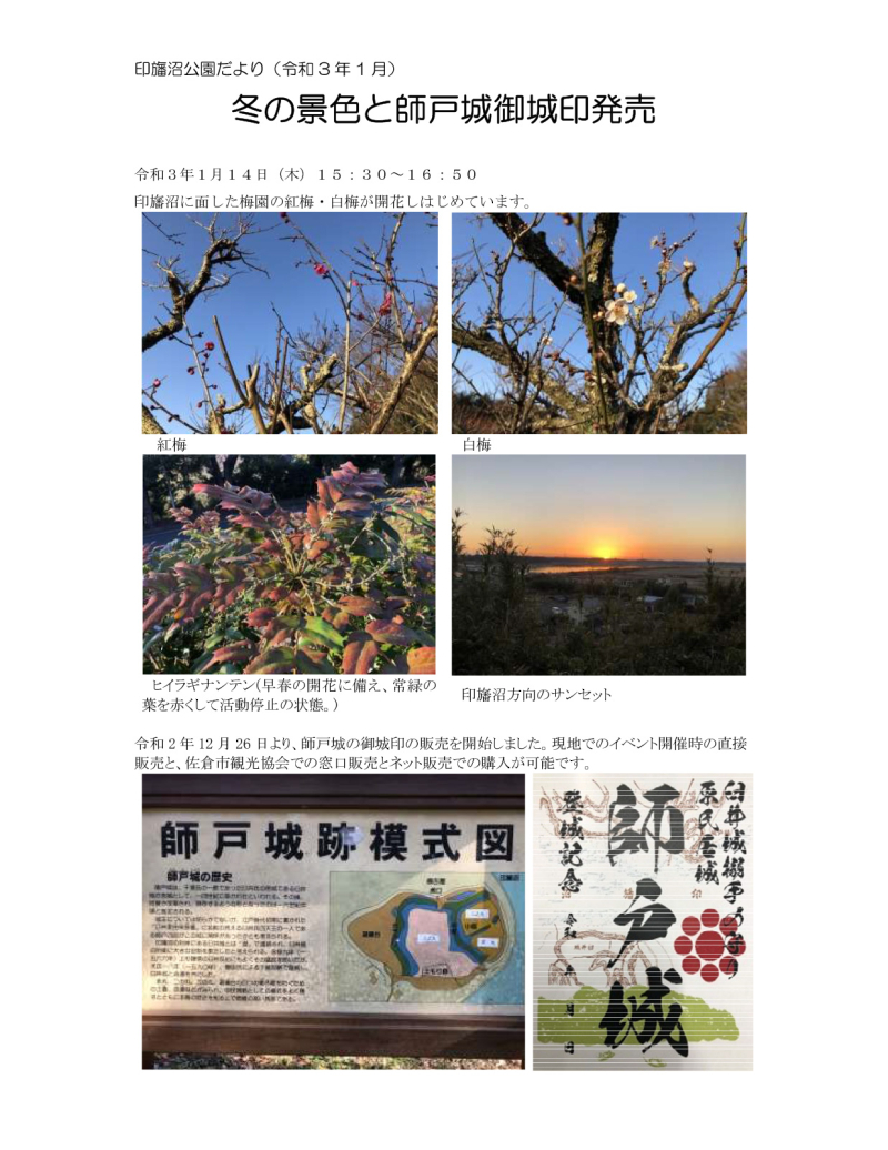 【印旛沼公園だより】冬の景色と師戸城御城印発売