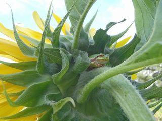 おや!ひまわりの裏に小さなお客さま(^-^)