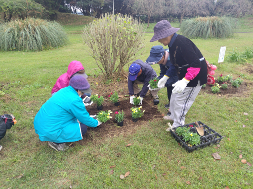 【印旛沼公園だより】季節の花でボランティアに公園を彩っていただきました。 2024年11月23日 最終更新日時 : 2025年10月2日 スタッフ1 ボランティア(みどりの会)に公園の花壇に季節の花を植えていただきました。 植えていただいたキンギョソウは春まで展望台前花木園で来園された方に楽しんでいただけるはずです。 活動の後は展望台からの眺めを楽しんでいただきました。
