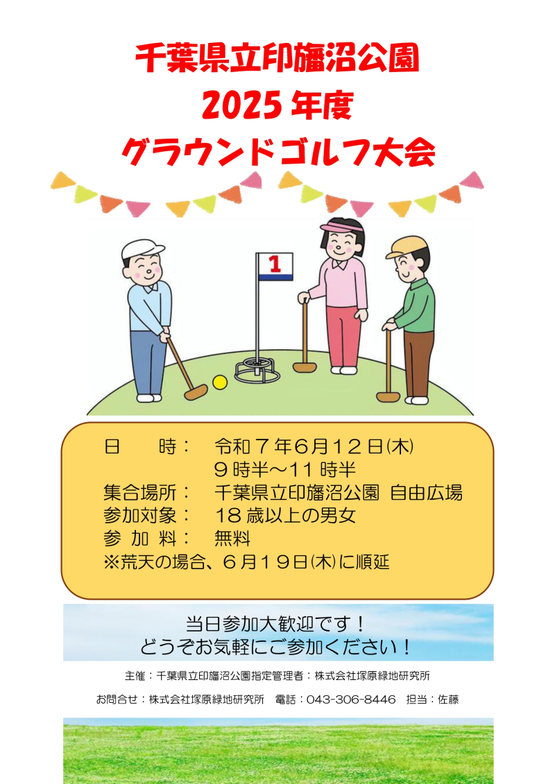 令和7年度グラウンドゴルフ大会を開催します 2025年5月16日 最終更新日時 : 2025年10月12日 スタッフ1 印旛沼公園にて2025年度グラウンドゴルフ大会を開催いたします。 当日参加も大歓迎です。 県民の皆様のご参加を待ちしております。