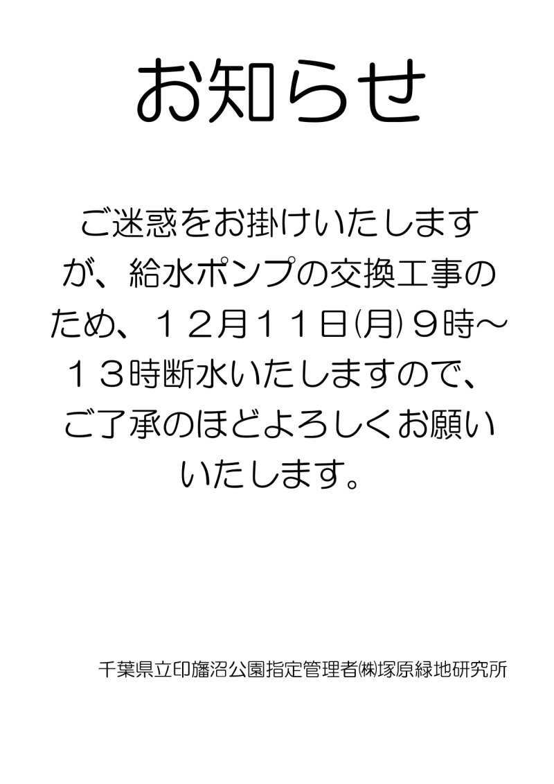 給水ポンプ交換工事による断水のお知らせ 2023年11月23日 最終更新日時 : 2025年10月11日 スタッフ1 給水ポンプ交換工事のため、令和5年12月11日(月)9時~13時断水いたします。 ご迷惑をお掛けいたしますが、ご了承のほどよろしくお願いいたします。