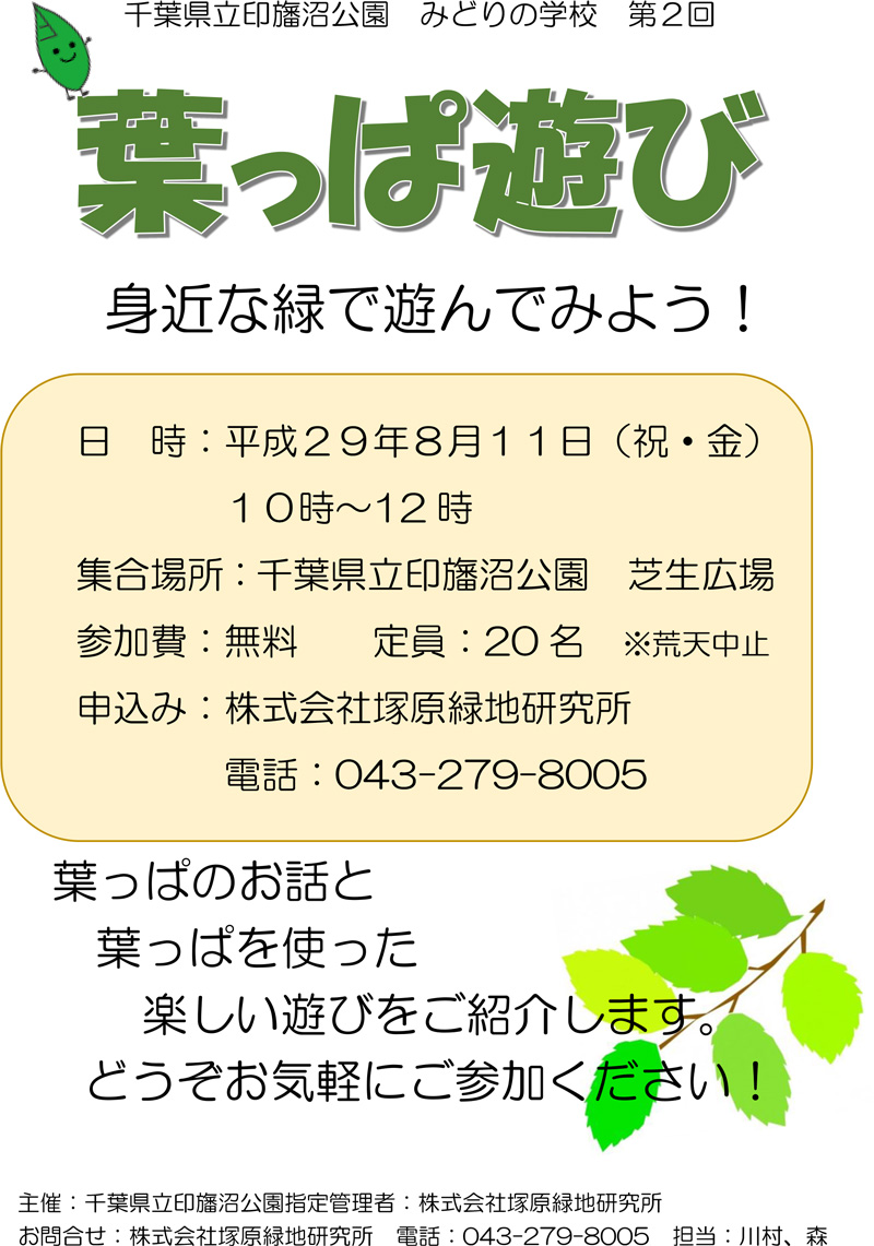 8月11日(祝・金) みどりの学校第2回「葉っぱ遊び」のお知らせ—身近な緑で遊んでみよう!