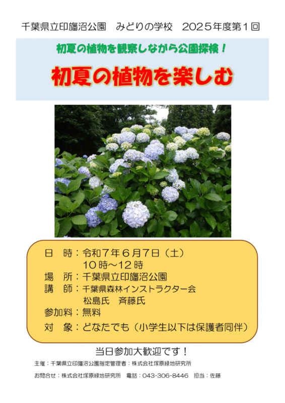 千葉県立印旛沼公園にて2025年度第1回みどりの学校を開催いたします。 今回のテーマは「初夏の植物を楽しむ」~初夏の植物を観察しながら公園探索~です。 みなさま奮ってご参加ください。 植物の専門家を講師としてお迎えし、ア […]