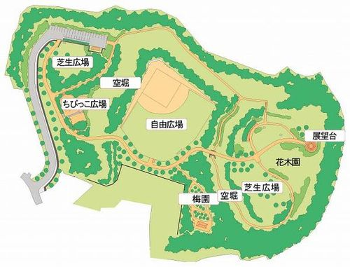 また、展望台のまわりは季節の花の楽しめる花木園やオープンスペースとして、広々とした芝生広場があり、休日には家族やグループがお弁当を食べたり、ボール遊びに興じるなどのんびりとくつろぐ姿が見うけられます。公園の中央にある自由広場は軟式野球場やグラウンドゴルフ場としても利用されています。